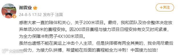 感谢大家一直的陪伴和关心,关于200米项目。最终,我和团队及协会整体决定放弃单项200米的赛程安排。因200项目赛程与接力项目日程安排有交叉时间紧凑,为全力保障冲刺男子4X100米项目。