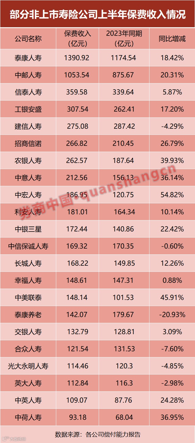 从两家最大的非上市寿险公司看,泰康人寿保费收入约1390亿元,同比增长18.42%;中邮保险保费收入1053亿元,同比增长20.31%。