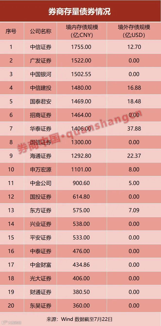 Wind显示,截至7月22日,74家券商境内存量债券规模约2.58万亿元,境外存债规模为139.68亿美元。债务规模居前的均是大型券商,如中信证券境内存债规模为1755亿元,其中2024年年内到期债务余额占382亿元。中小券商中,国投证券债务规模居前,境内存债614.80亿元,其中2024年年内到期债务余额为215.80亿元。
