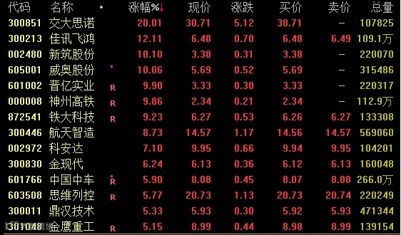 铁路基建概念盘中强势拉升,截至收盘,交大思诺“20cm”涨停,佳讯飞鸿涨超12%,新筑股份、威奥股份、晋亿实业、神州高铁等涨停,铁大科技涨超9%,中国中车涨近6%。