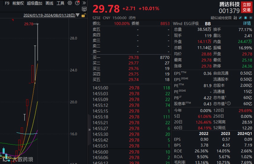 腾达科技尾盘再度拉升封涨停,收盘报29.78元/股,股价创上市以来新高。至此,该股已连续9个交易日涨停,累计大涨约136%。