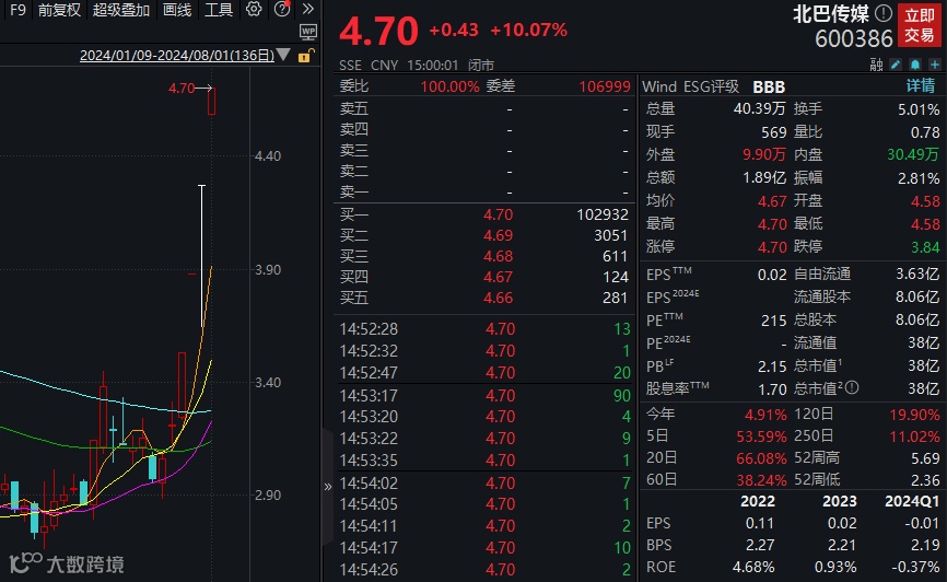 北巴传媒今日再度涨停斩获4连板,公司昨日晚间提示,关注到近期汽车拆解概念受市场关注度较高。公司之全资子公司天交公司的经营范围包括汽车拆解业务。天交公司2023年度营业收入4152.10万元,占公司合并口径营业收入的0.86%,其营业收入占比较小。目前天交公司生产经营正常,短期内对公司经营活动不会产生重大影响。