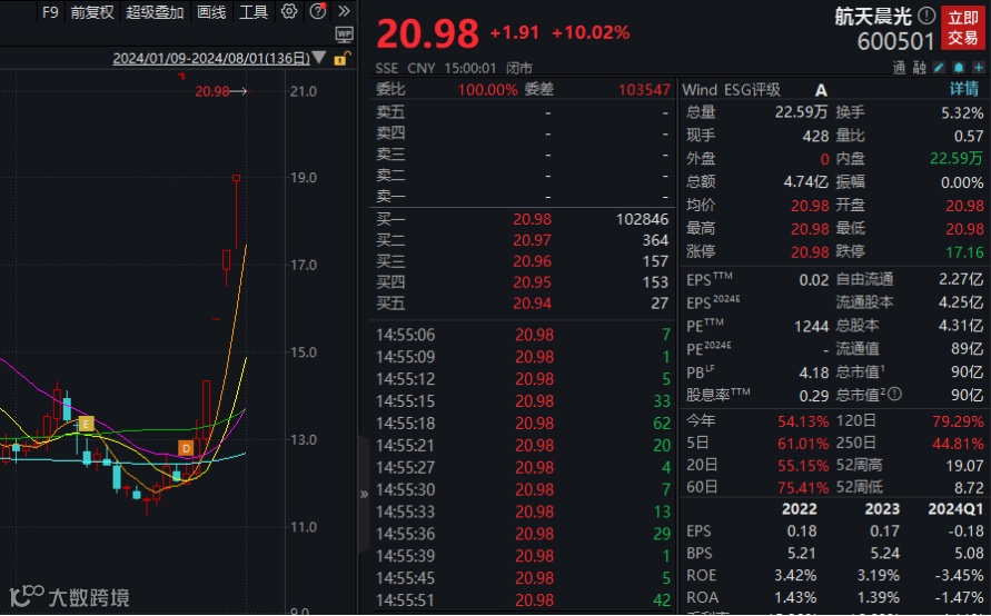 航天晨光已连续5个交易日涨停。公司昨日晚间发布风险提示称,公司主营业务涉及智能制造、核工装备、后勤保障、柔性管件、环保装备、压力容器等板块,产品主要应用于石油化工、水利水电、核电、环卫、能源装备等领域。公司应用于商业航天领域的产品主要是保障发射任务配套使用的金属软管,2023年该部分收入约2700万元,收入占比相对较小。公司收入结构短期内不会发生重大变化。