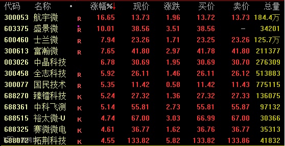 半导体板块午后拉升走高,截至收盘,航宇微涨近17%,盛景微涨停,士兰微、富瀚微涨近8%,中晶科技涨近7%。