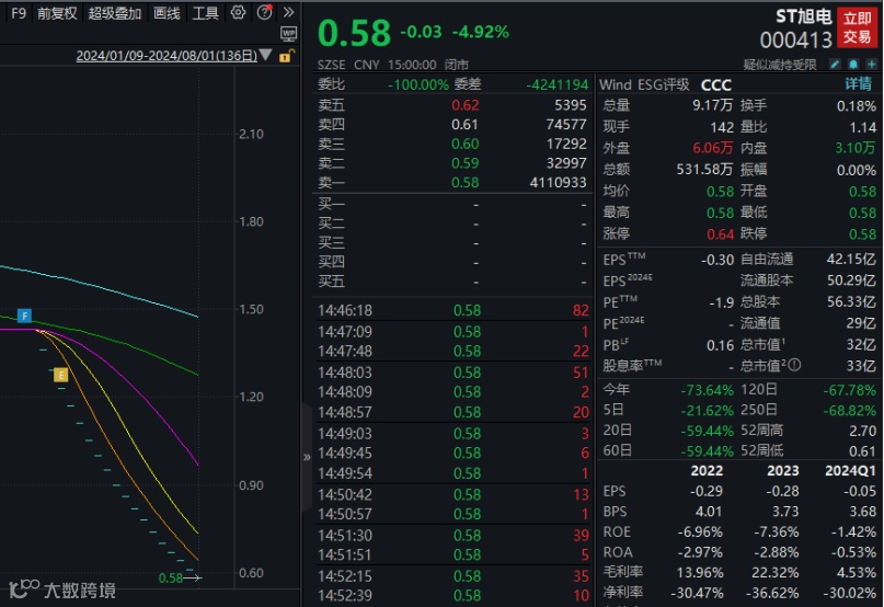 今日,ST旭电再次跌停,连续18个交易日跌停。收报0.58元,连续11个交易日收盘价低于1元。据证券时报记者测算,即便未来9个交易日,该股连续涨停,收盘价也无法回到1元以上。