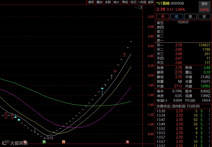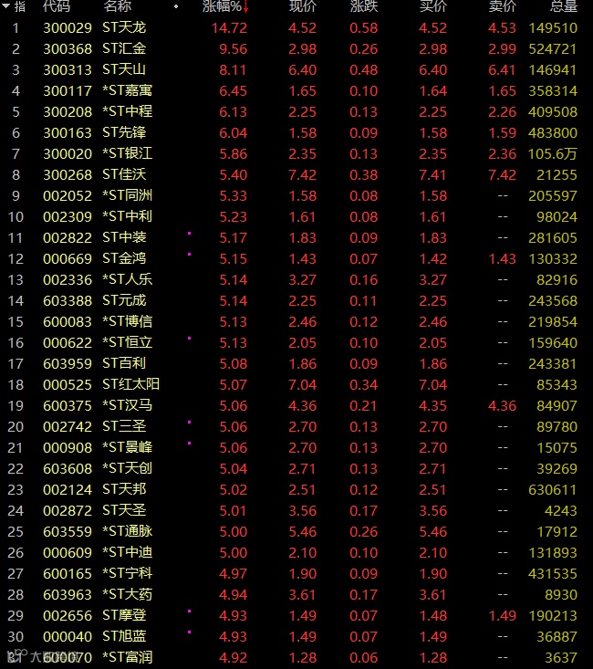 ST板块午后活跃,*ST景峰走出9连板,9天累计涨幅达56.07%,目前该股27天26板;ST百利、ST三圣、ST天邦、ST中装等20余股涨停。