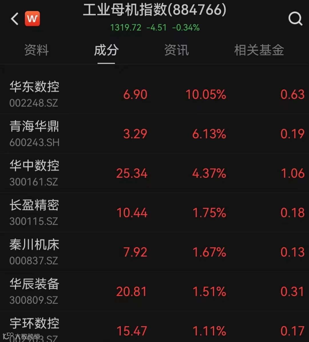工业母机概念今日午后快速拉升,华东数控涨停,报6.9元/股,成交1.82亿元,换手率超9%。青海华鼎、华中数控、长盈精密等股跟涨。