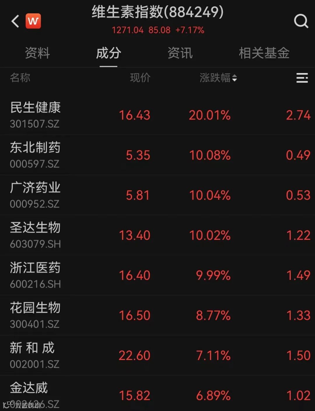 维生素板块全天强势,板块掀涨停潮,尔康制药、民生健康、东北制药、圣达生物、广济药业、浙江医药、能特科技涨停。