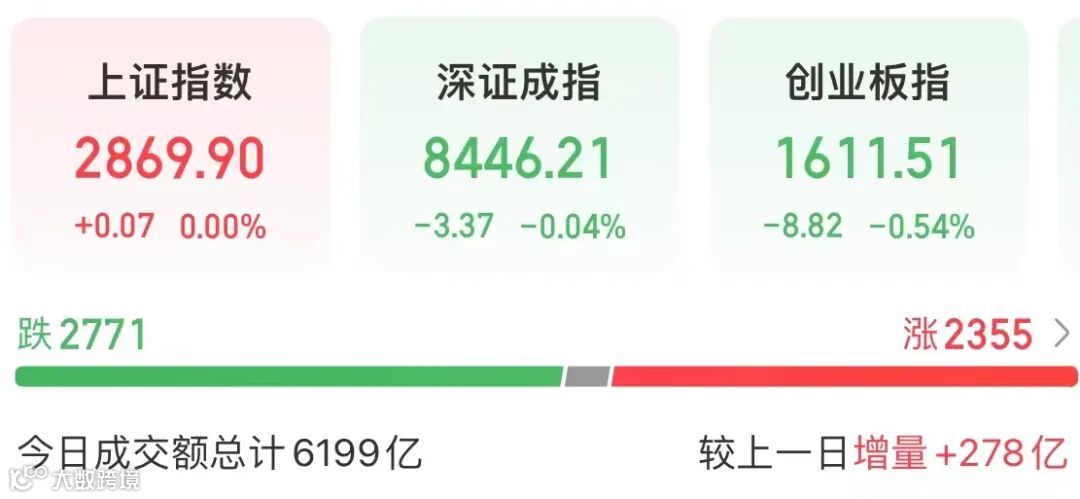 截至收盘,沪指涨0.07点,报2869.90点,深成指跌0.04%,报8446.21点,创业板指跌0.54%,报1611.51点。