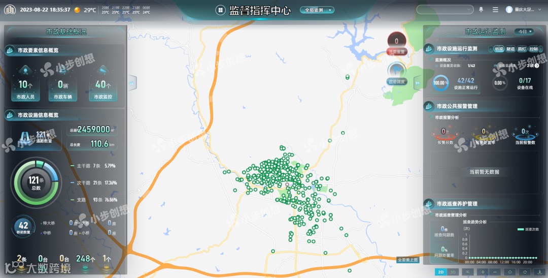 重庆大足区通过智慧市政“一张图”,可以实时感知市政设施的运行情况,对照明、桥隧、道路、井盖等各类市政设施信息可视化展示,出现异常情况实时告警,辅助工作人员对市政设施全生命周期掌控,实现市政设施隐患早发现、问题早响应,危机早处理。