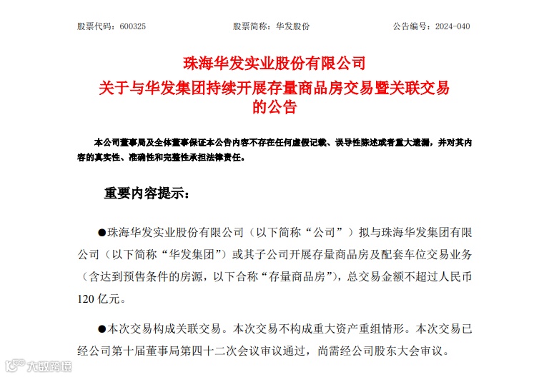 A股上市公司华发股份(600325)8月9日下午披露,公司拟与珠海华发集团有限公司(下称“华发集团”)或其子公司开展存量商品房及配套车位交易业务(含达到预售条件的房源,合称“存量商品房”),总交易金额不超过120亿元。