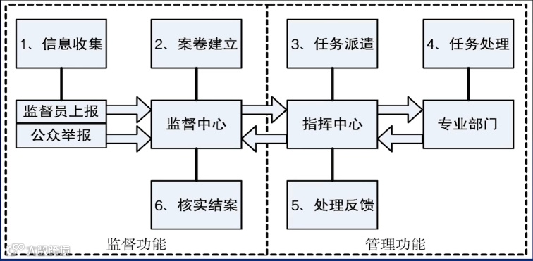 即数字城管模式。对象是各处置机构,从发现问题、派遣问题、处置问题、监督、结果到考核,完成7个环节的闭环管理,是直接对每个处置个体考核到位、监管到位的工作方法。