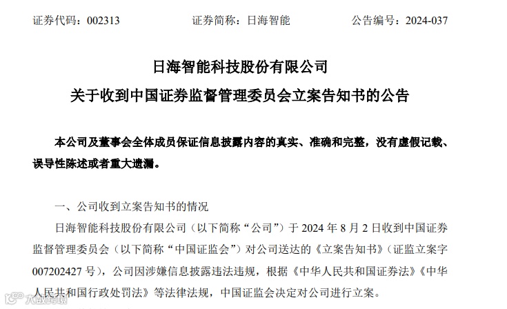 8月2日晚间,日海智能(002313)公告,公司于8月2日收到中国证监会对公司送达的《立案告知书》,公司因涉嫌信息披露违法违规,根据《中华人民共和国证券法》《中华人民共和国行政处罚法》等法律法规,中国证监会决定对公司进行立案。