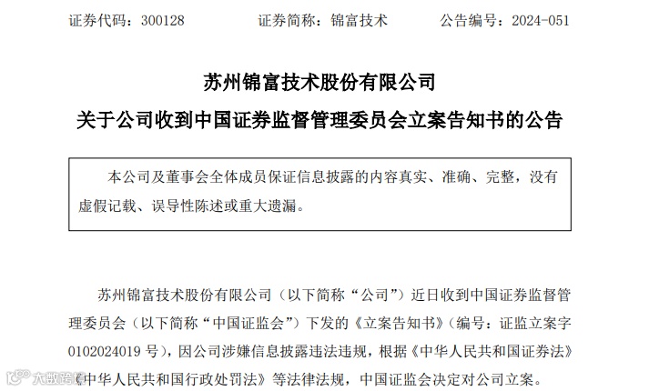 无独有偶,另一家上市公司锦富技术(300128)昨日晚间也披露了收到证监会立案告知书的公告。