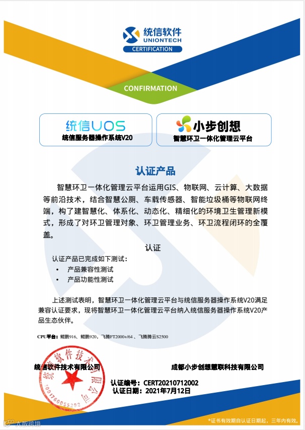 取得统信UOS及华为鲲鹏技术双认证,标志着智慧环卫一体化管理云平台已满足在国产化运行环境中稳定运行的需求。是小步创想在适配国产化道路上迈出的坚实一步。