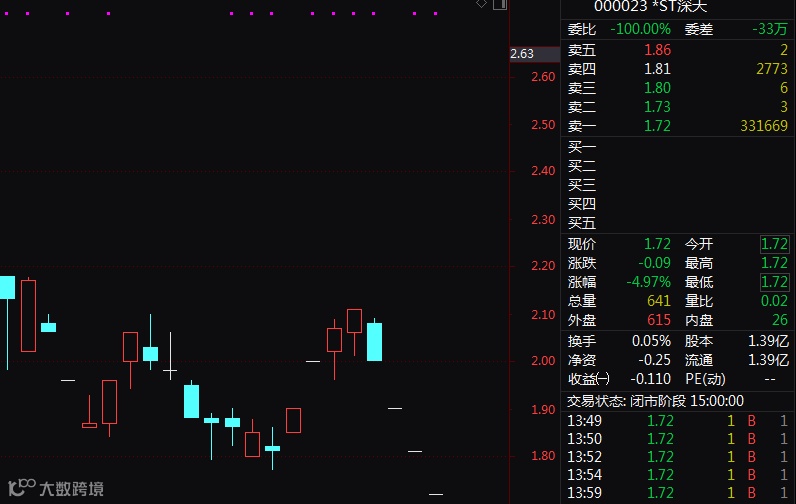 7月24日,*ST深天开盘即跌停,最终以跌停收盘,每股1.72元,4天累计跌幅达18.48%,总市值为2.4亿元,这天也成为目前*ST深天在A股交易的最后一天,此前,该公司市值已连续19个交易日低于3亿元,并连续多日发布了多个风险提示公告,称公司股票收盘总市值连续二十个交易日低于3亿元,公司股票将存在被终止上市的风险。
