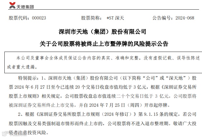 7月24日晚,*ST深天最新公告,公司股票2024年6月27日至今已连续20个交易日收盘市值均低于3亿元,根据《深圳证券交易所股票上市规则》相关规定,公司股票收盘总市值连续二十个交易日低于3亿元,公司股票将被深交所终止上市交易,并自2024年7月25日(周四)开市起停牌。