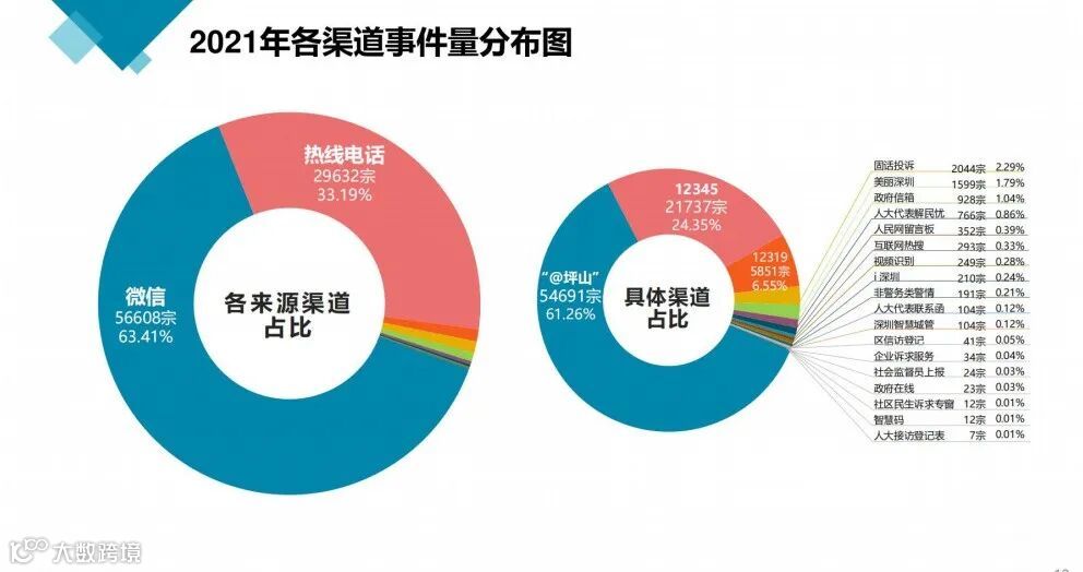 从深圳坪山区数据变化看,热线电话和微信上报占绝大部分,其中,微信上报量已经远超热线电话,这两种上报方式都是代表老百姓个人对政府的诉求,而其余政府定制只占4%,这意味着城市管理服务来源将面对更多的群众需求。