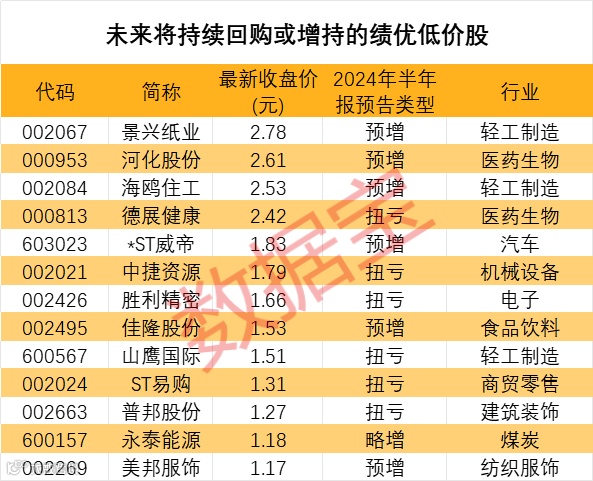 进一步统计来看,未来将持续回购(回购正在实施中或预案阶段)或增持(进行中),且2024年半年报预喜(扭亏、预增、略增)的低价股仅有13只。
