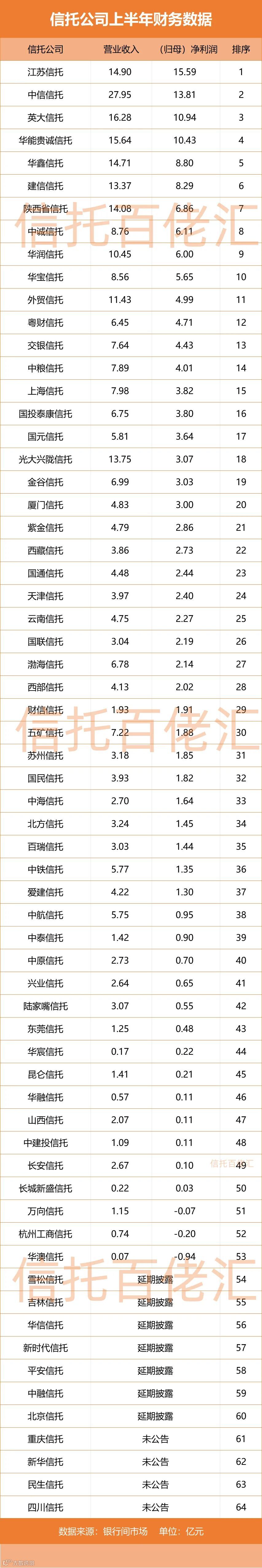 据券商中国·信托百佬汇记者统计,上半年有13家信托公司净利润不足1亿元,另有万向信托、杭州工商信托和华澳信托等3家公司出现亏损。