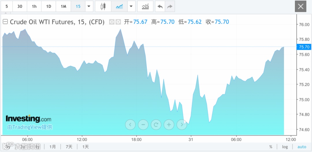 消息发布后,国际油价短线走高,WTI原油现涨1.32%,报75.7美元/桶;现货黄金价格小幅拉升,现涨0.42%,报2461.95美元/盎司。