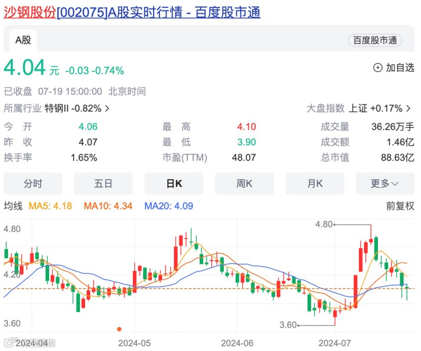 截至最新收盘,沙钢股份报4.04元/股,总市值88.63亿元。
