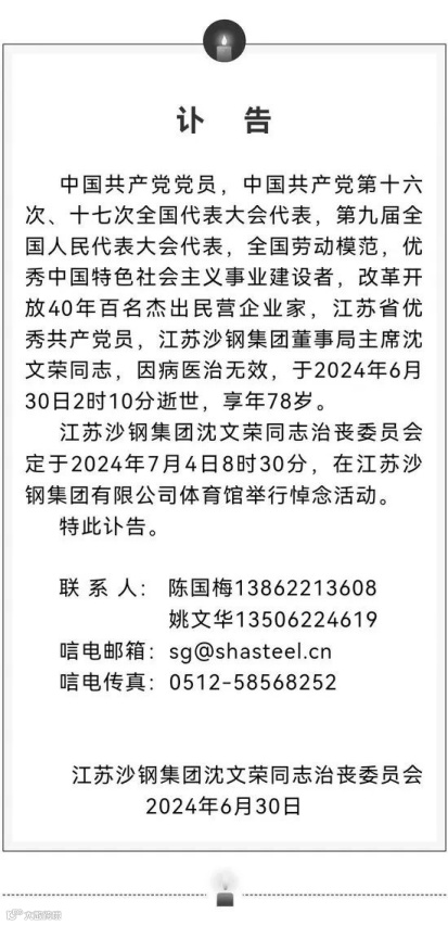 6月30日,沙钢集团发布讣告:中国共产党党员,中国共产党第十六次、十七次全国代表大会代表,第九届全国人民代表大会代表,全国劳动模范,优秀中国特色社会主义事业建设者,改革开放40年百名杰出民营企业家,江苏省优秀共产党员,江苏沙钢集团董事局主席沈文荣同志,因病医治无效,于2024年6月30日2时10分逝世,享年78岁。
