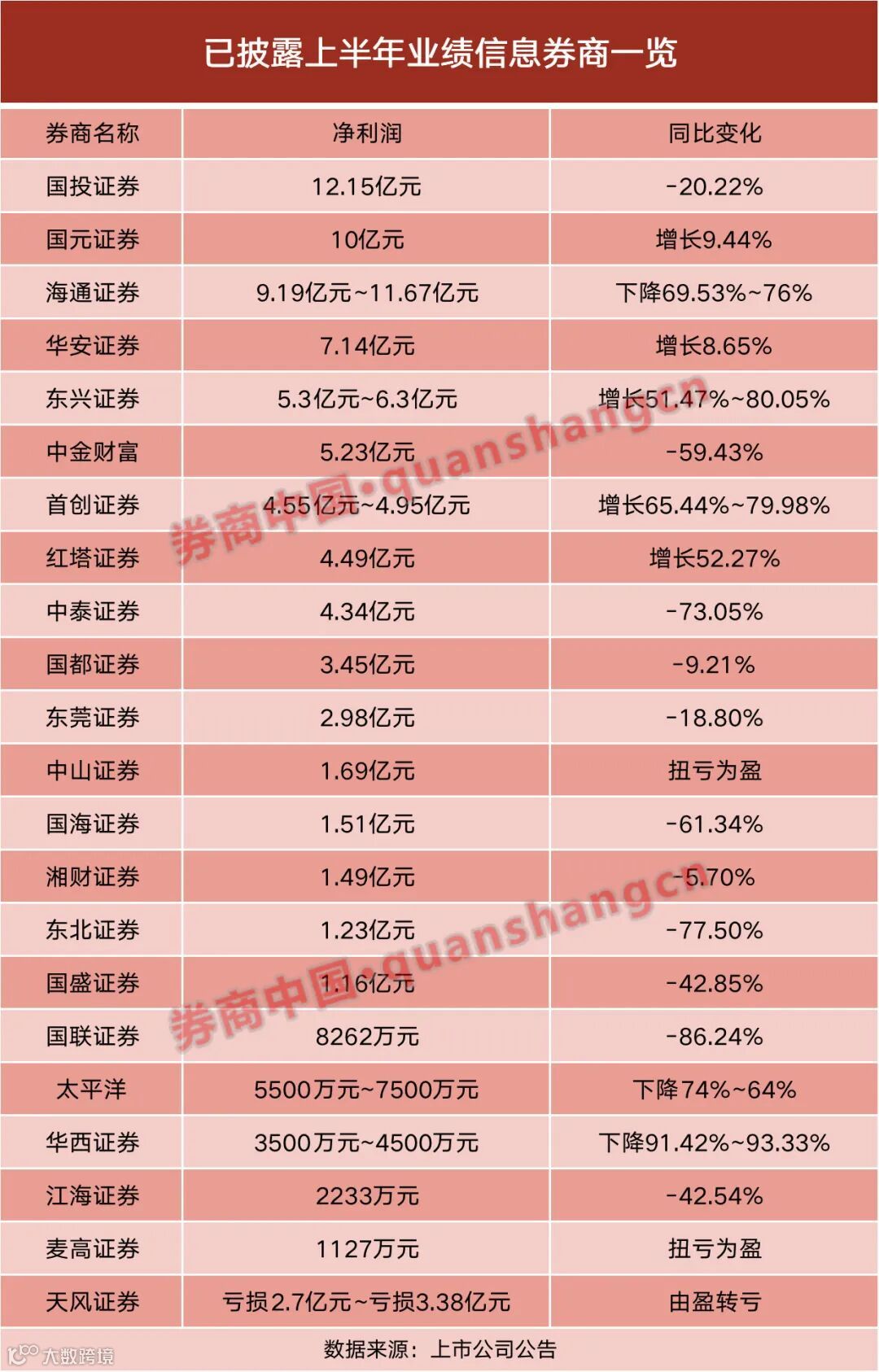 数据显示,21家已发上半年业绩信息券商中,有6家券商上半年净利润保持增长,其中,2家扭亏为盈;15家券商业绩下滑,其中1家由盈转亏。