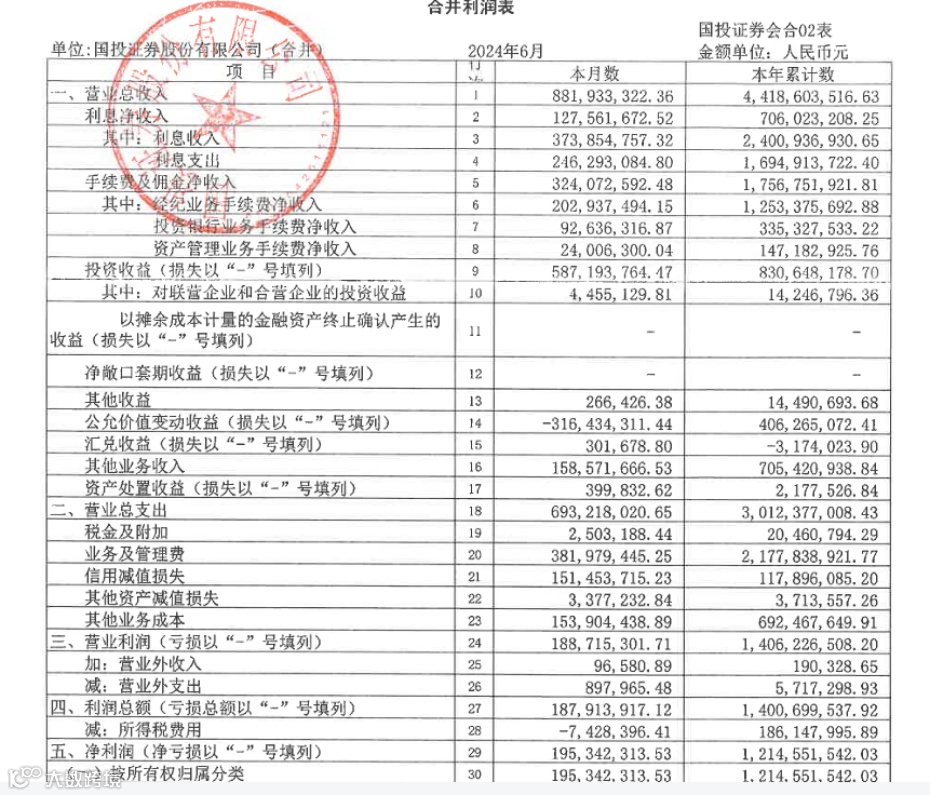 数据显示,国投证券今年上半年实现营业收入44.19亿元,净利润12.15亿元,较2023年上半年营业收入55.23亿元和15.23亿元分别下降20%和20.22%。