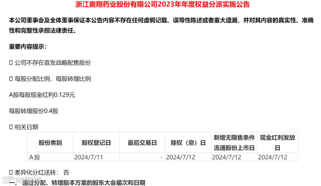 近日,奥翔药业的公告显示,该公司拟每股转增0.4股,股权登记日为7月11日。