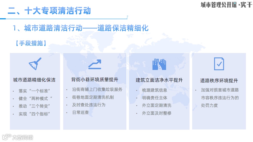 其中,在城市道路精细化保洁方面我们主要采取了4种措施。