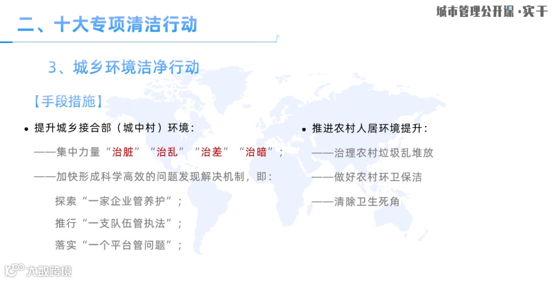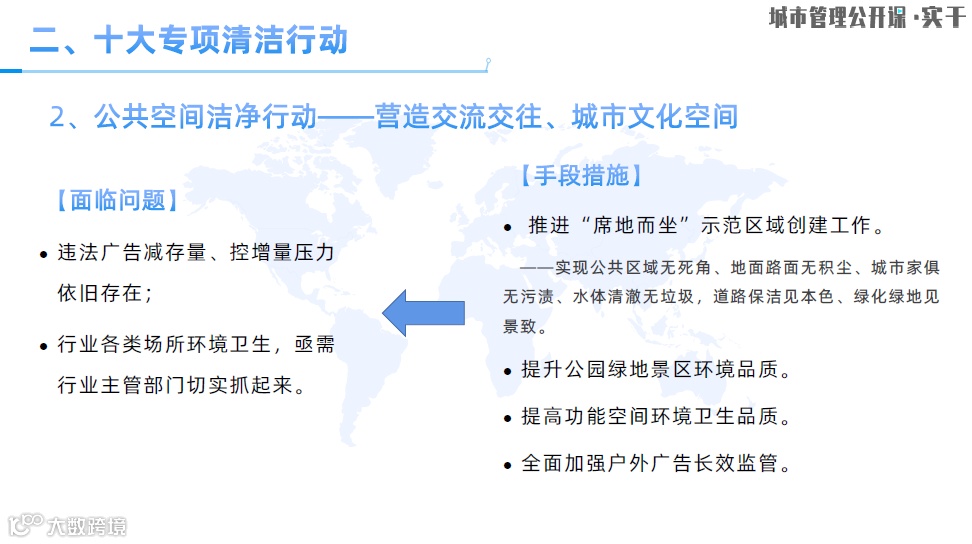 我们也根据专项行动重点研究了一套测评体系,希望建立一项能够反映市容环境品质的干净指数测评机制,通过动态测评,以评促建、以评促改,能够及时监测和发现各个区域内市容环境方面存在的问题,并及时加以改善。