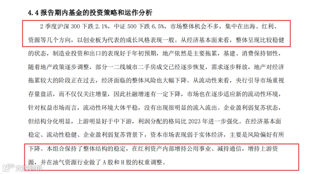 针对此,4名基金经理在二季报里写了约400字的运作分析,大部分是对已发生行情的简单复述,如“2季度沪深300下跌2.1%,中证500下跌6.5%,市场整体机会不多,集中在出海、红利、资源等几个方向”等表述。真正算得上基金运作分析的,只有寥寥数语:该基金组合保持了整体结构的稳定,在红利资产内部增持公用事业、减持通信,增持上游资源,并在油气资源行业做了A股和H股的权重调整。