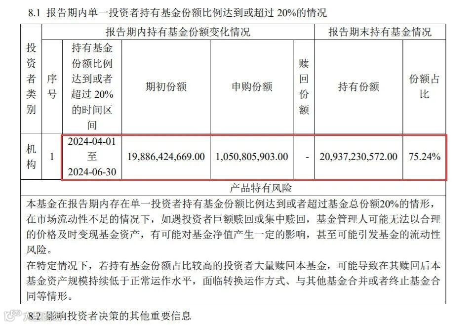 华夏基金备受关注的,还有华夏上证50ETF。该基金是国内首只ETF,截至今年二季度末规模达到了1130.05亿元。和华夏沪深300ETF类似,华夏上证50ETF的份额变化不大,从459.15亿份增长至462.76亿份。其中,有一位机构投资者在二季度末里申购了5.64亿份,截至二季度末该投资者持有总份额达到了287.92亿份,占比62.22%。结合2023年年报和今年一季报情况来看,该投资者这大概率也是中央汇金。
