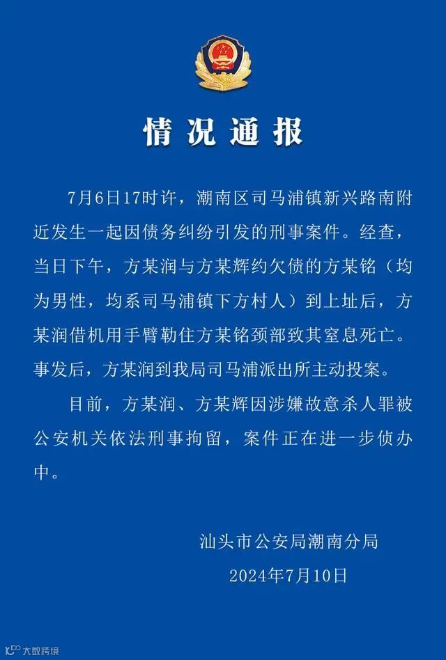 据媒体此前消息,汕头方先生称,7月6日晚15岁的儿子被两名同龄男生约到学校,遭勒颈致死,方先生表示三人此前是朋友。村干部证实凶案发生。派出所称刑警已介入,两人被抓。