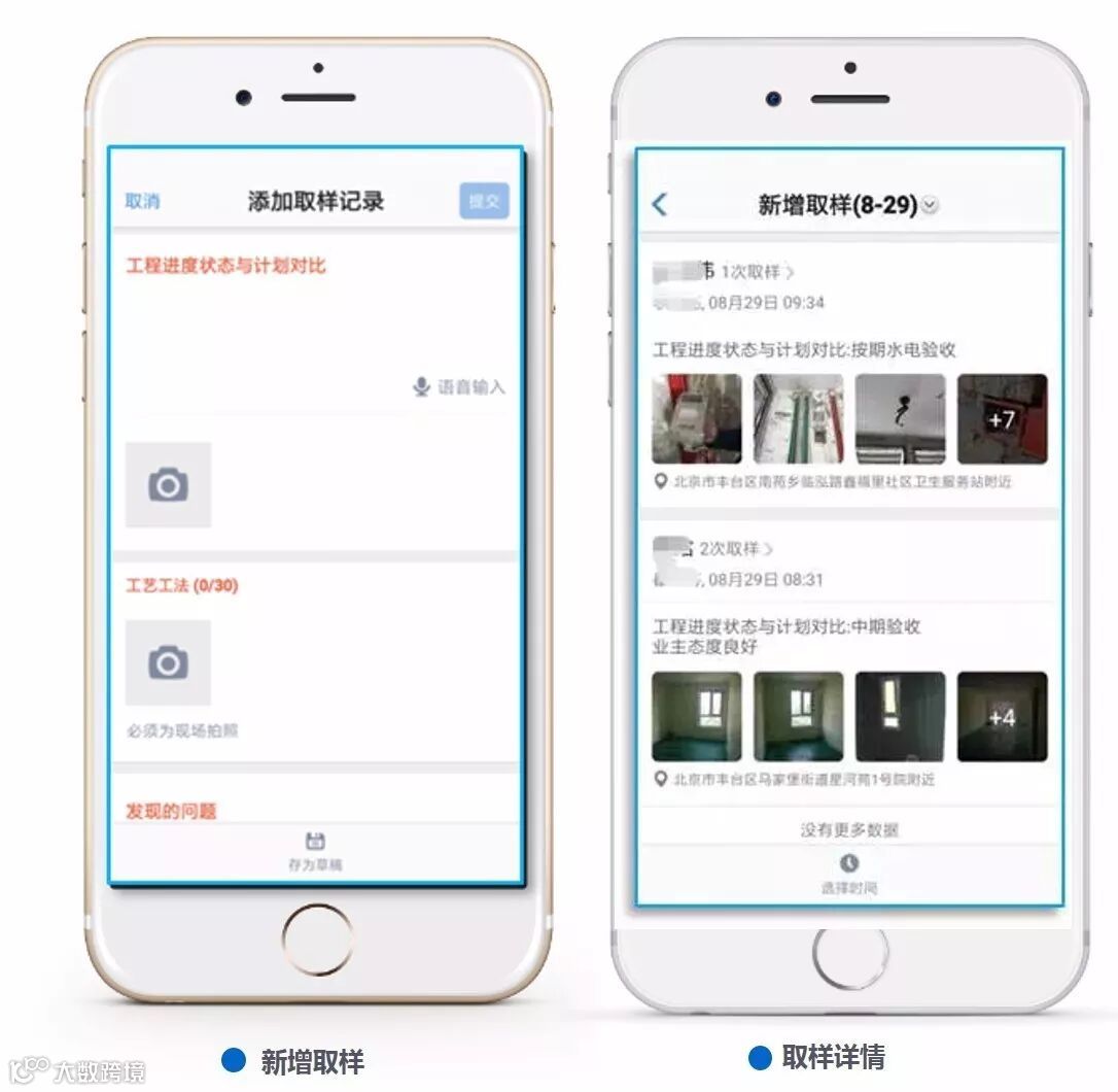 ②员工每天在现场作业的取样照片,可实时进行上报,自动进行项目归类,实现全自动分析整理;附带现场拍摄的水印照片,领导可以在手机端实时看到员工是否真实到现场进行作业。