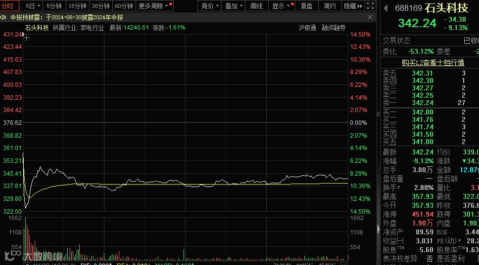 石头科技早盘大幅低开,之后两分钟内跌幅一度超14%,收盘跌幅收窄至9.13%。上周五晚间,石头科技发布半年报业绩预告,预计上半年归母净利润为10亿元至12亿元,同比增长35.24%至62.29%;预计扣非净利润8亿元至9.5亿元,同比增长21.17%至43.89%。