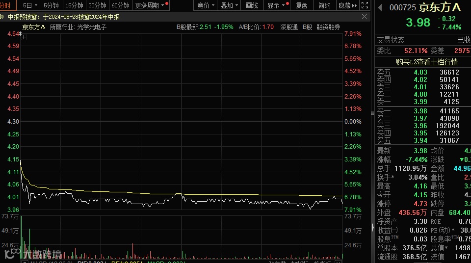 京东方A披露的业绩预告显示,公司预计上半年净利润为21亿元至23亿元,同比增长185%至213%。不过业绩大增并未刺激公司股价上涨,该股今日下跌7.44%,全天成交45亿元,量比达到2.99倍。