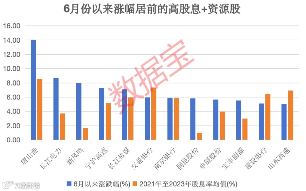 据数据宝统计,高股息板块(中证红利指数成份股)和万得资源股板块6月平均跌幅分别为4.4%、8.16%,前者小幅跑输上证指数。两大指数共计230只个股,48股6月上涨,12股涨超5%。