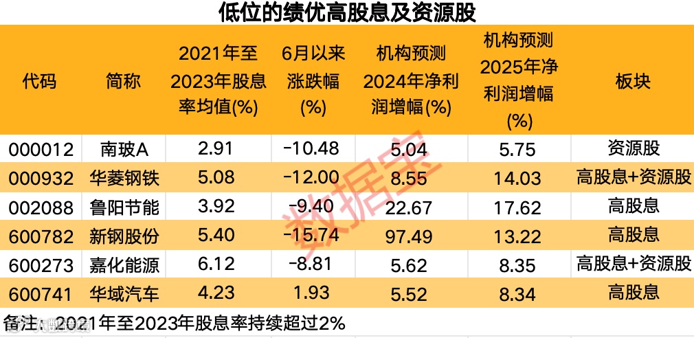 进一步统计,上述230家高股息和资源股中,2021年至2023年股息率持续超过2%,且最新收盘价较6月最低收盘价溢价低于5%,机构一致预测2024年、2025年净利润有望持续增长的个股仅有6只。