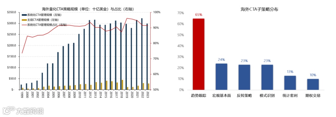 迈德瑞中国副总经理康兰在“潜龙杯”论坛中指出,全球CTA策略管理规模中超过90%都是量化CTA策略,主观占比不足5%。尽管CTA策略细分方法众多,趋势跟踪策略一直是CTA策略的主流,规模占比超过65%。