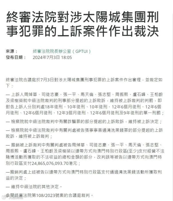 据澳门特别行政区政府网站,7月3日,澳门终审法院对涉太阳城集团刑事犯罪的上诉案件作出裁决:裁定周焯华维持被上诉裁判的判罚,即判处18年徒刑。