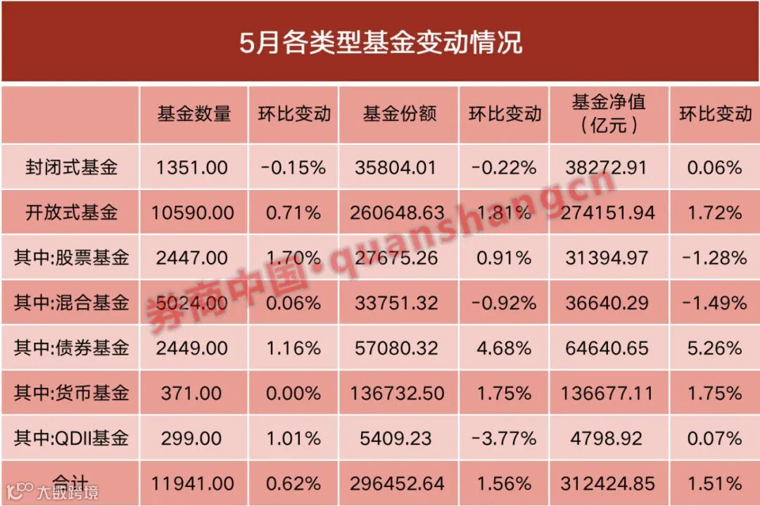 但债基和货基却逆势将公募基金整体规模推升至新的高度:债基5月份内份额增加了约2600亿份,净值则增加了3200亿份,环比增加幅度为5.26%;货币基金净值增加了2354.2亿元,环比增1.75%。