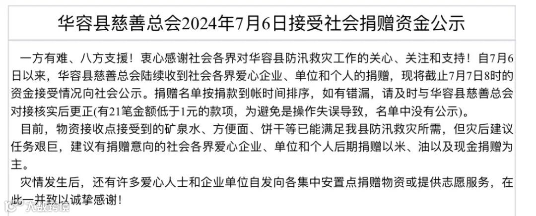 据了解,近日来,湖南省岳阳市华容县团洲垸洞庭湖一线堤防发生管涌险情。7月6日,华容县慈善总会发布关于接受社会捐赠的告知书。