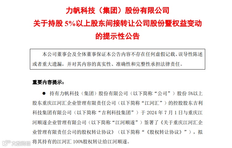 力帆科技7月2日晚间披露,公司股东重庆江河汇企业管理有限责任公司(下称“江河汇”)的控股股东吉利科技集团与重庆江河顺遂企业管理有限公司(下称“江河顺遂”)签署了《股权转让协议》,拟将其持有的江河汇100%股权转让给江河顺遂。交易总价为24.3亿元。