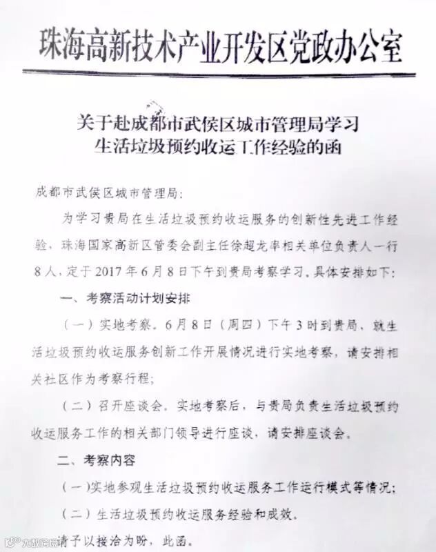 (珠海市高新区党委办公室致武侯区城管的学习专函)