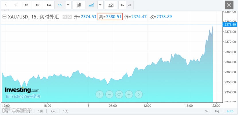 现货黄金持续拉升,盘中突破2380美元/盎司,为6月7日来首次,现报2382.2美元/盎司,日内涨1.04%。现货白银日内涨幅扩大至2%,现报30.99美元/盎司。