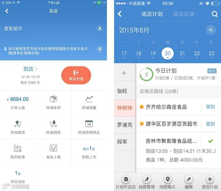 到店签到(到店时间、偏差、现场拍照)、离店签退、现场拍照、竞品上报、自动核算在店时长