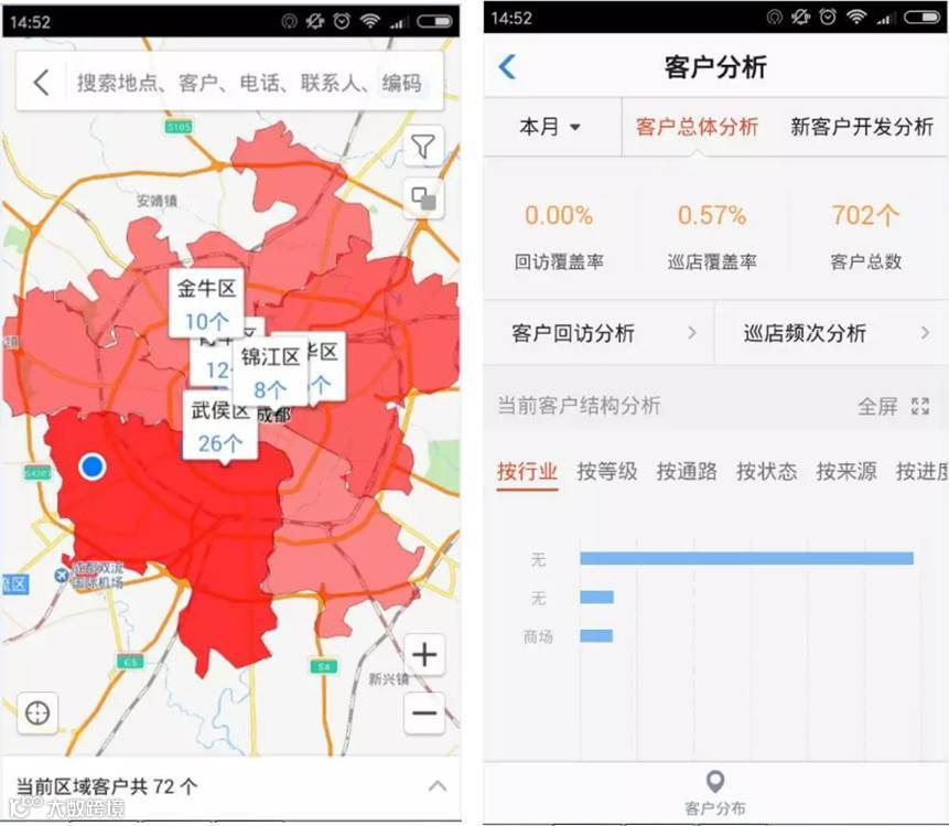 客户管理模块:将业务员手里的老终端信息导入系统中,业务员在巡店开发到新的终端后,将客户信息新增进系统,从而实现了客户资料的集中统一管理;业务员可以在自己的手机端查看自己负责区域内各地区客户分布情况,市场开发力度等。