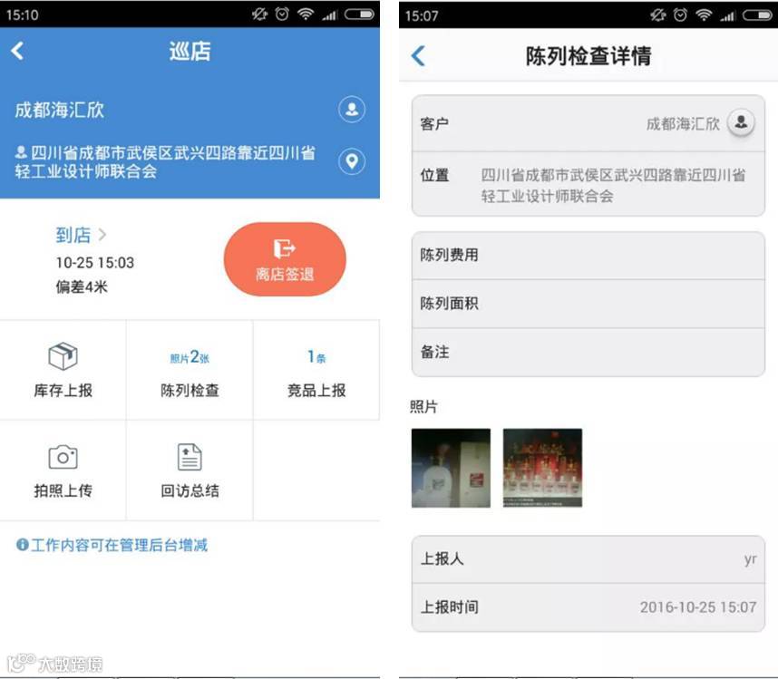 终端巡店模块:业务员定期对自己辖区的渠道和终端进行客情维护,并通过终端陈列、终端库存、竞品上报、巡店总结等上报终端信息,管理者可随时掌握业务人员工作质量,保证业务员标准化作业;通过上报单明细对各项员工上报的业务数据进行统计汇总,管理者可以及时了解到终端信息,并作出应对方案。